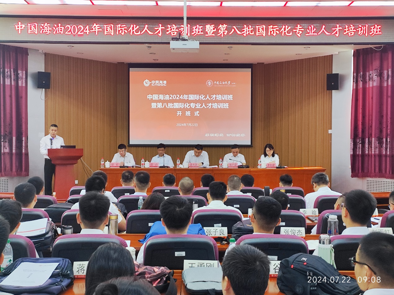 7月22日,由中国石油大学(北京)网络与继续教育学院承办的第八批国际化专业人才培训班隆重开班。中国海油党组组织部副部长、人力资源部副总经理孟元凯、中国石油大学(北京)副校长张广清、中国海洋石油国际有限公司副总裁、党委副书记邵丹、海油国际人力资源部总经理李如茵、中国海油人力资源部人才开发处处长胡航等参加开班式,中国海洋石油国际有限公司副总裁、党委副书记邵丹主持开班式。