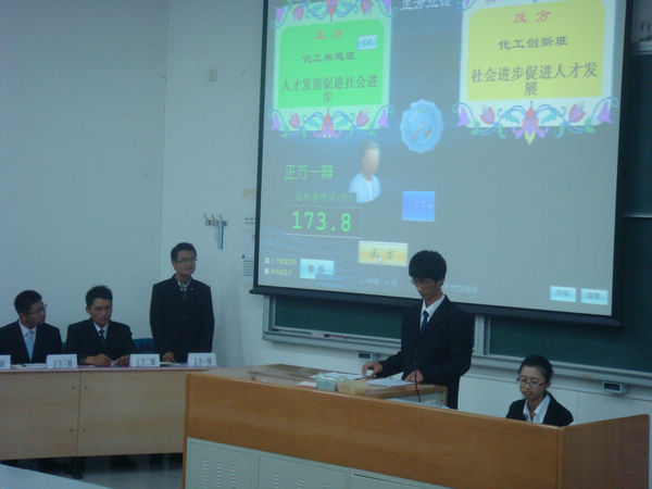 2011年10月12日晚,“化工学院辩论赛-看我七十二辩”在三教306圆满落幕。上届“优秀辩手”的李建建、袁琳、郑达等担任这次比赛的评委。辩论双方是化工卓越班和化工创新班,分别是持“人才发展促进社会进步”观点的正方和持“社会进步促进人才发展”观点的反方。