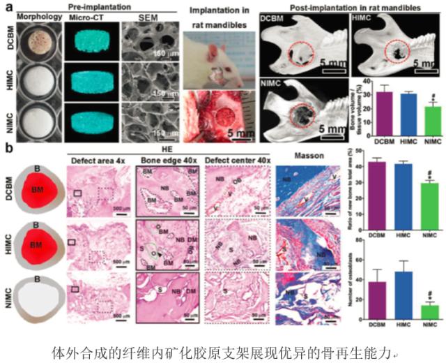 近日,中国石油大学(北京)新能源与材料学院罗聃副研究员与北京大学口腔医院刘燕副研究员合作,以共同第一作者的身份报道了一种热力学控制的合成有序组装纤维内矿化胶原的方法。所合成的矿化纤维支架展现与天然骨高度一致的生物界面,并表现出强大的内源性干细胞募集能力。进一步细胞和动物实验证明,人工合成支架可诱导干细胞多相分化,诱导成骨及血管生成;并通过体内宿主干细胞归巢诱导骨髓形成。