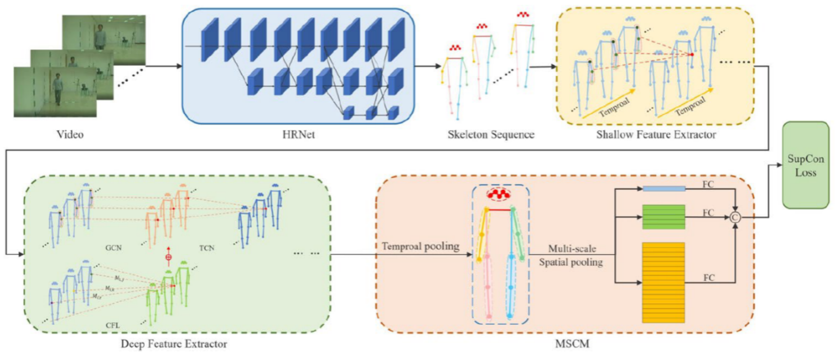 本文将步态视为骨架序列,首先利用输入姿势估计网络HRNet生成骨架步态序列。接着先提取骨架步态序列的浅层特征,再使用协调特征学习器(CFL)提取协调特征与时空特征融合得到深层特征。随后,深层特征经多尺度级联模块(MSCM) 得到关节、肢体和姿势三个尺度的特征,沿空间维度拼接形成步态特征,最后使用SupCon损失来训练整个提出的模型。整体架构如图3所示。