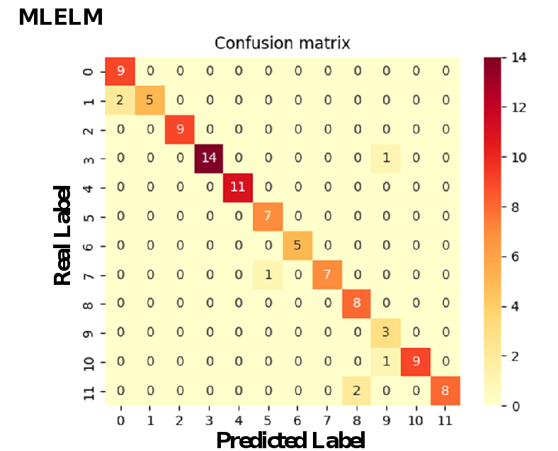 分类结果的混淆矩阵如图5所示。可以看出,在处理稀缺故障样本问题时,MLELM在12种电潜泵故障类别的综合准确率要平均高出其他三种改进ELM算法8%左右,F1-score要高出0.8分左右,KAPPA要高出0.9分左右。在总12种类型中,全部都分对的类型有7种,并有10种类型的准确率和8种F1-score得分高于其余三种算法。