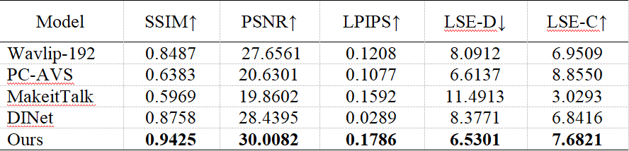 我们在VoxCeleb1和HDTF上评估我们的AaICNet,这两个数据集分别是低视觉质量数据集和高视觉数据集。VoxCeleb1包含有1251个说话人脸视频,而HDTF包含有430个高分辨率的说话人脸视频。我们在VoxCeleb1上训练我们的AaICNet并在HDTF上进行测试。我们利用结构相似性(SSIM)、峰值信噪比(PSNR)和感知图像块相似性(LPIPS)指标来评估低级相似性和感知相似性。同时,为了验证我们的架构是否能够生成准确的唇部运动,我们还使用唇部同步误差距离(LSE-D)和唇部同步误差置信度(LSE-C)作为我们的评价指标。下图为与其他四个不同的方法在HDTF数据集上的表现对比,进一步证明了我们的方法的有效性。