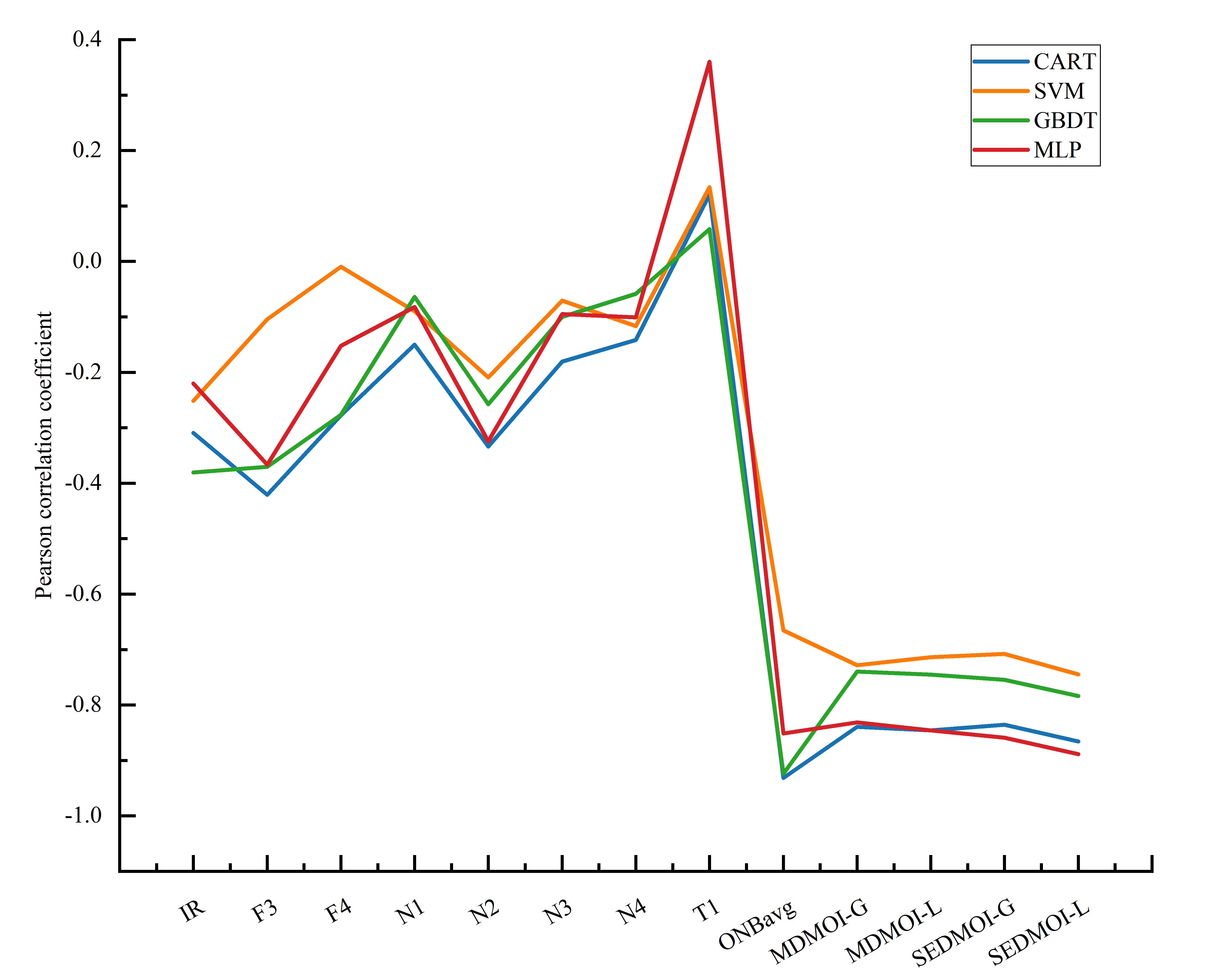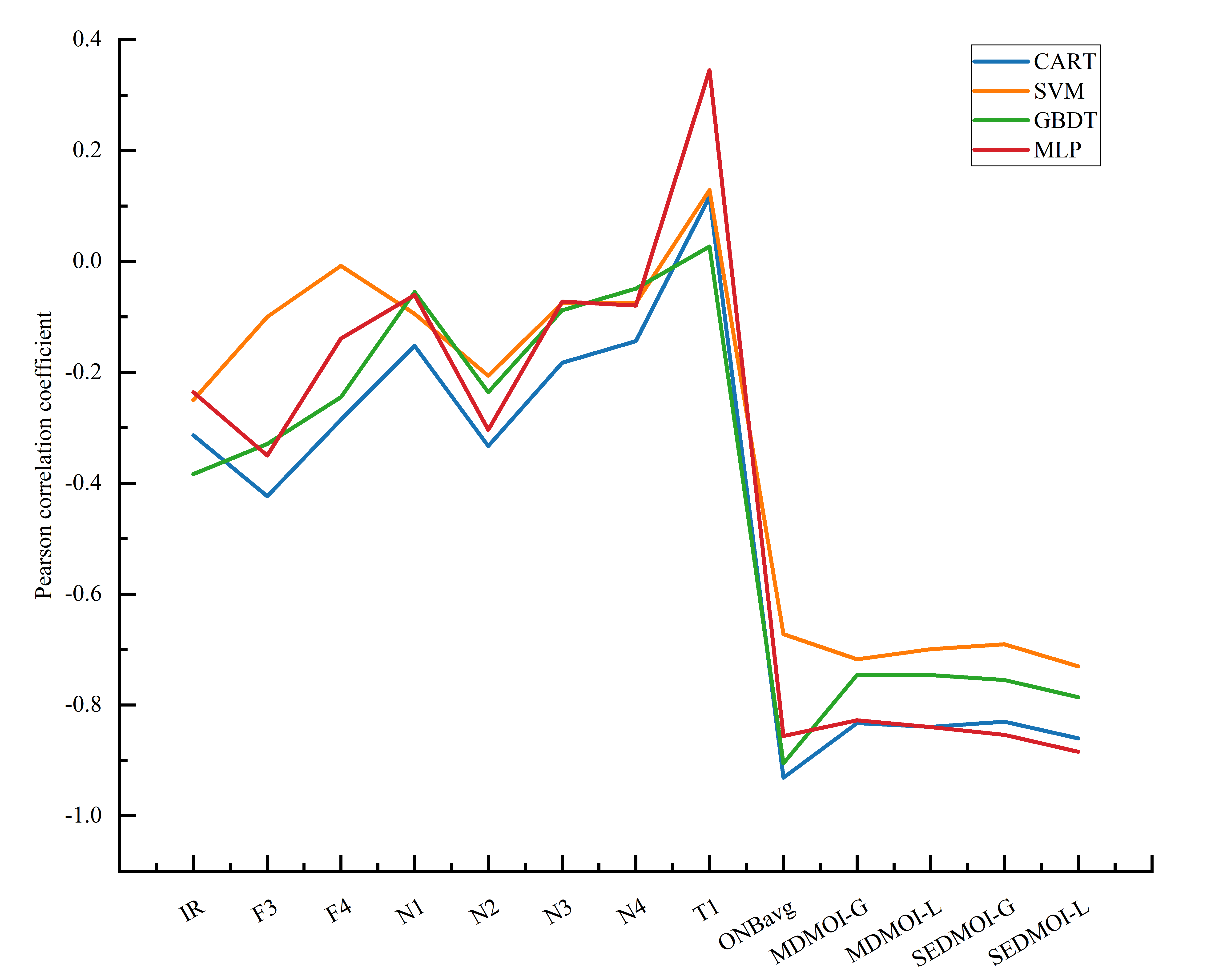 在50个不平衡数据集上进行对比实验,并计算分类结果与复杂度度量方法之间的皮尔逊相关系数,实验结果如下所示。