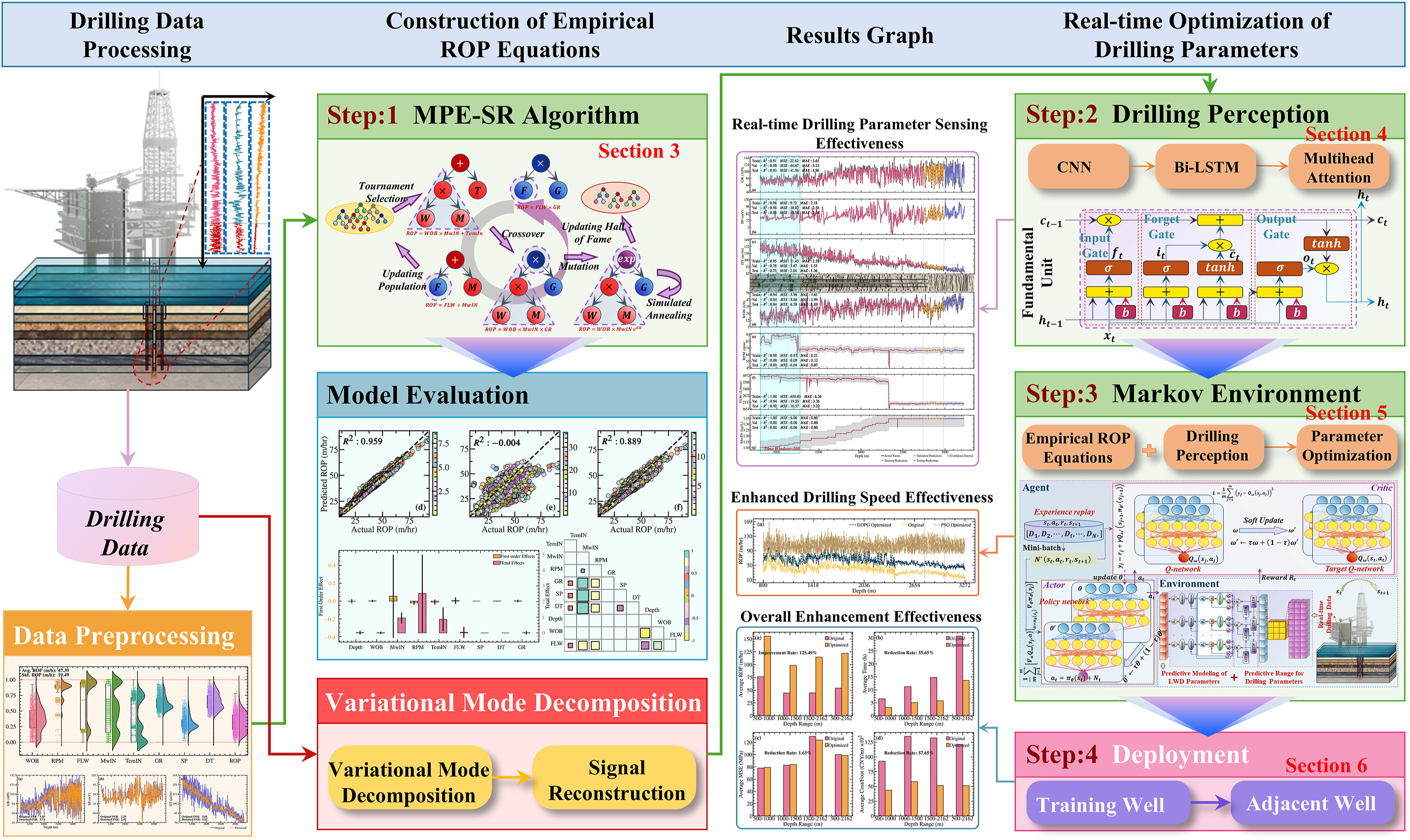 本文提出了一个多目标钻井参数优化框架,结合符号回归、时间序列网络和马尔可夫决策过程,以精确预测钻进速度、地层条件,并实时优化钻井参数。包括用于构建经验方程的多群体进化符号回归算法、用于数据预处理的变分模态分解和样本熵的集成,以及用于提高预测准确性的多头自注意力时间序列网络。分位数回归进一步估计钻取参数调整的范围。此外,还开发了一种钻井参数优化深度确定性策略梯度算法来自动进行实时参数调整。对南海乐东10-1 区块的实证分析表明,钻井速度显著改善:ROP 从 54.18 m/hr 增加到 122.17 m/hr,机械比能从 100.82 MPa 下降到 97.78 MPa,每英尺成本从 121.16 × 102 CNY /m 降低到 51.31 × 102 CNY/m。