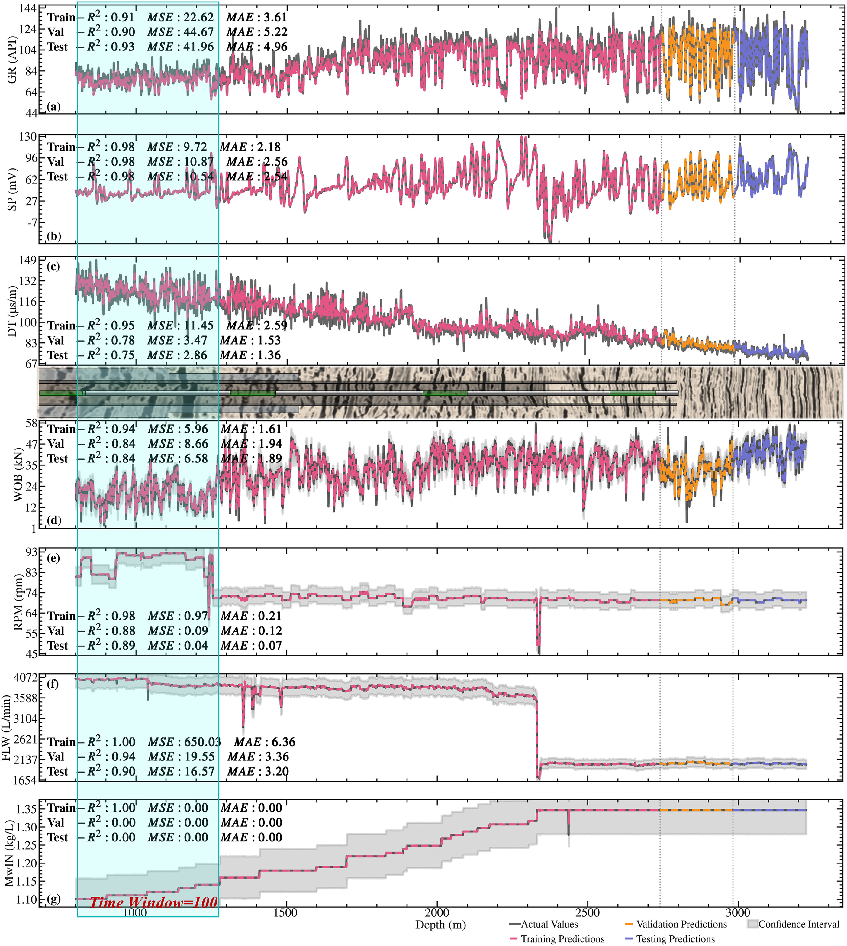 使用VMD-CNN-BiLSTM-MA 模型预测关键测井参数,此外,引入分位数回归方法和分位数损失函数构建CNN-BiLSTM-MA-QA模型,用以预测关键钻井参数潜在调整范围,增强实时决策的适应性和响应性。使用南海乐东 10-1 区块的某口井现场数据,评估了 VMD-CNN-BiLSTM-MA 和 CNN-BiLSTM-MA-QA 模型在预测关键随钻测井参数(GR、SP 和 DT)以及钻井参数(WOB、RPM、FLW、MwIN和 TemIN)方面的有效性。如图3所示的预测结果提供了两种模型性能的直观比较,突出了它们在实际钻井环境中的能力。