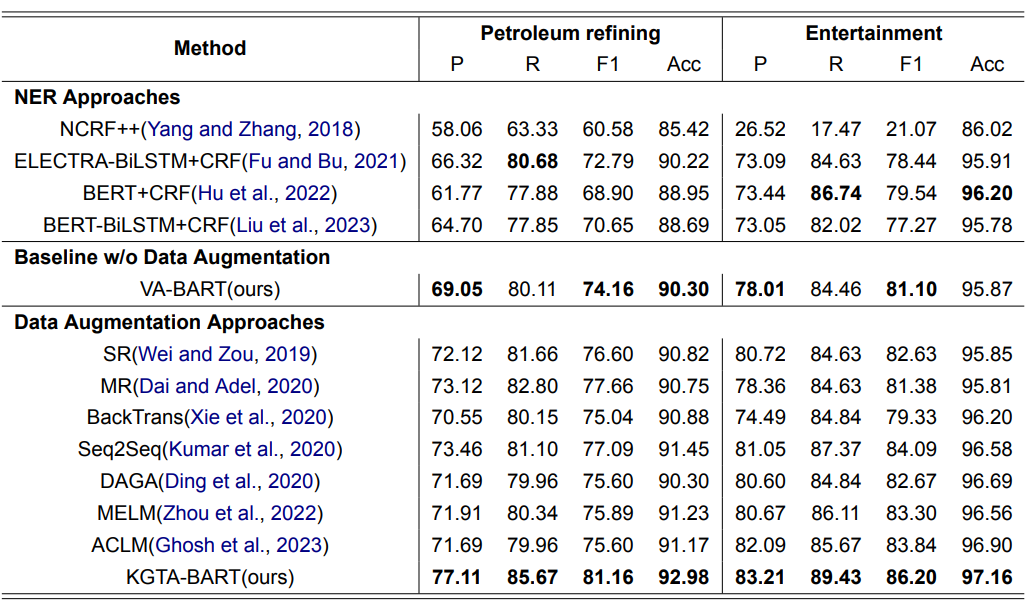 根据表2的结果,我们提出的基于KGTA-BART的VA-BART方法在石油炼化以及娱乐两个中文专业领域的NER方法和数据增强方法层面上皆表现出卓越的效果。首先,在NER方法层面上,将一些预训练模型作为基线,我们的命名实体识别模型相对于性能最佳的基线模型,在无增强数据条件下都获得了最佳效果。此外,在数据增强的层面上,经过各种数据增强方法扩展的数据集均基于我们的VA-BART上进行命名实体识别,结果显示我们提出的KGTA-BART数据增强方法也都获得了最佳效果。