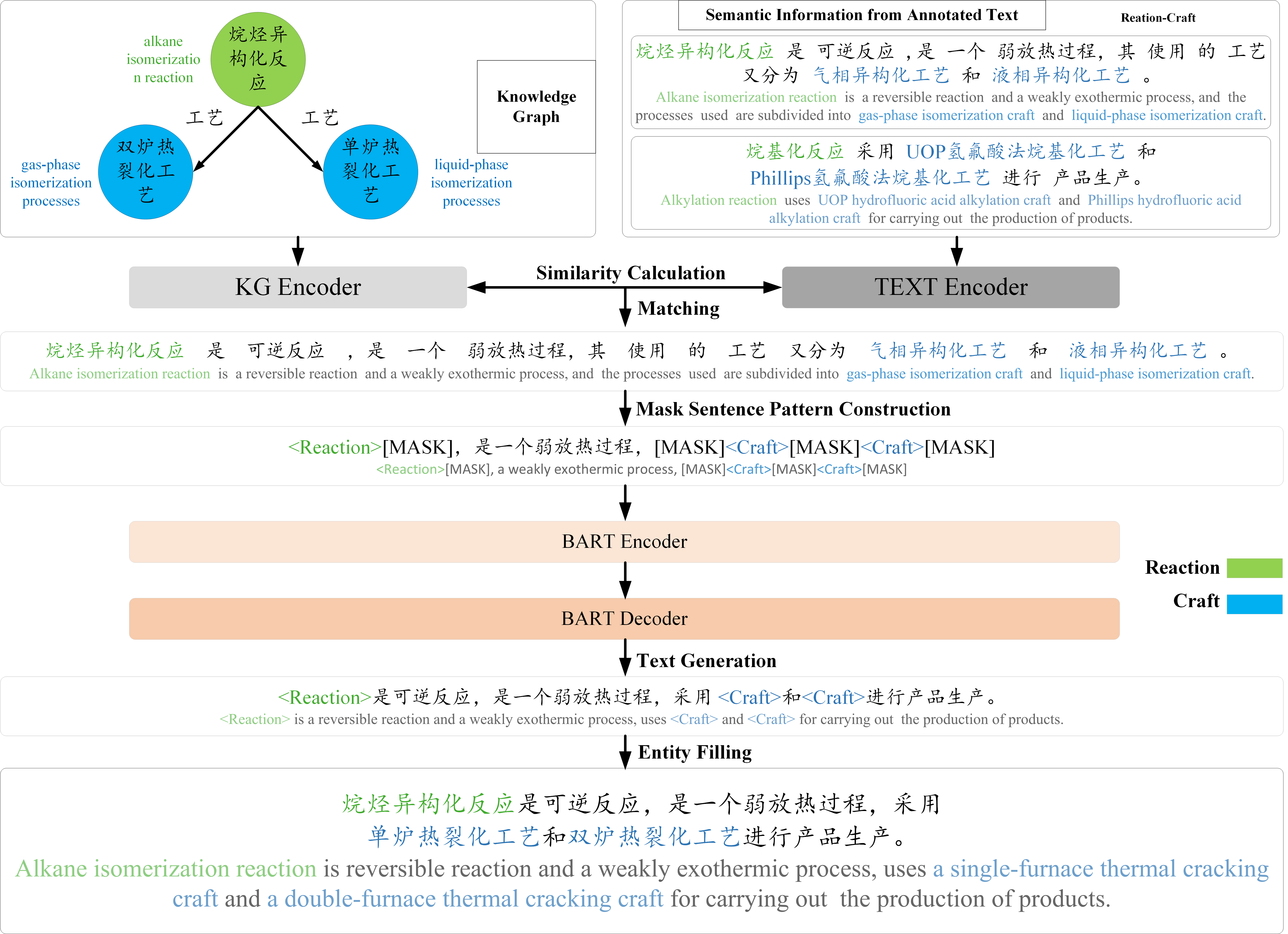 在KGTA-BART训练完之后,使用训练完的模型进行文本生成,概述图如图2所示。在文本生成阶段,首先将含图信息的知识图谱与含语义信息的已标注的文本中与知识图谱标签类型相同的文本进行编码并基于相似度计算进行图文对齐匹配相似度最高的文本,之后通过掩码句式构建并基于BART生成句式文本,最后进行实体填充生成增强文本。