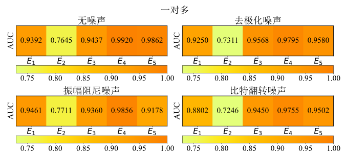 针对一对一和一对多模型的数值模拟实验结果呈现在图3和图4中。对于一对一模型,在许多情况下,AUC大于0.95,有些情况甚至达到了1.0,表明方法有着极高的分类性能。对于一对多模型,与一对一模型相比,准确度略有下降,可能是因为考虑了更多的分类。然而,分类准确度仍然相当可观。