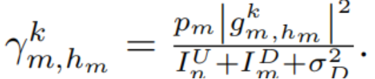 根据上述描述,多个请求用户可以与选择k信道的原始蜂窝用户来重用同一信道。蜂窝用户在基站侧的信干燥比(SINR)为: