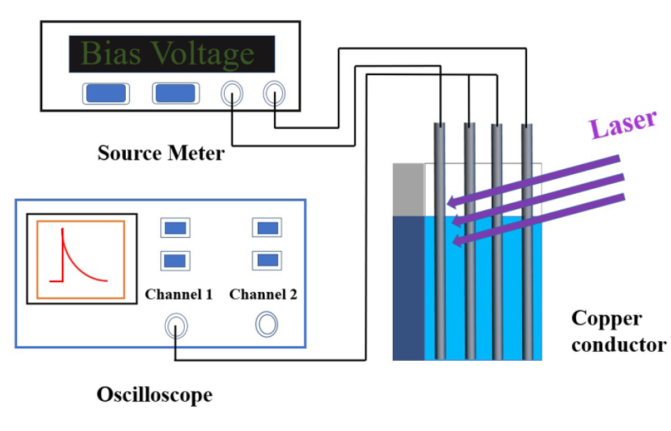 原油样品来自委内瑞拉。实验设备示意图如图1所示。在实验过程中,我们使用248 nm准分子激光辐射样品。激光辐射在样品表面的能量Ein是38.8 mJ。用于记录LIPTS的示波器的带宽为350 MHz,输入阻抗为1MΩ。源表Keithley 2400被用作电压源,偏置电压Vb的调节范围是60 V~200V。石英比色皿的尺寸是20 mm×45 mm,厚度为10 mm。