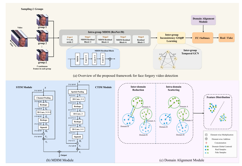 深度伪造视频是逐帧生成的,可能造成时空异常信息。因此挖掘时空信息线索在提升深度伪造视频的检测能力方面具有关键作用。时空异常信息会存在于短时连续帧中,同时也会存在于长时非连续帧中,先前的研究忽略了两种时间视角的交互作用,导致时空异常信息提取不足。另外,伪造技术和数据集之间的存在较大的分布差异,现有算法无法处理。在此背景下,全面挖掘时空异常信息及和更好应对不同伪造技术间的分布差异显得尤为重要。