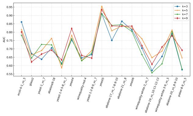 在30个不平衡数据集上进行参数敏感实验,并与其他先进方法进行对比实验,实验结果如下所示。