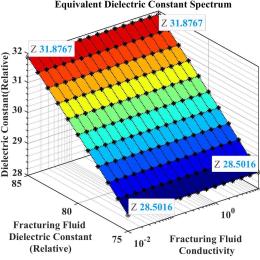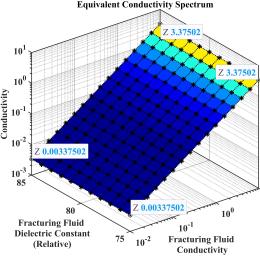 在实验部分,我们基于FEM对支撑裂缝内容物进行等效结构建模。将讨论基于数值模拟的裂缝填料的等效电导率和等效介电常数的特征。通过计算发现,在使用低电导支撑剂情况下,裂缝内容物的介电常数与压裂液的电导率呈正相关。在使用高导支撑剂条件下,可以观察到内容物等效相对介电常数不再与压裂液的电导率密切相关,它只与内容物组分的介电常数有关。内容物等效电导率与组分电导率有很强的相关性,并且随着内容物组分电导率的增加而增加。