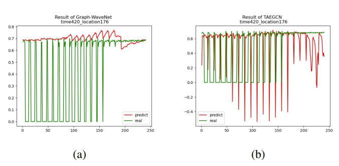 为进一步测试TAEGCN的预测性能,从METR-LA数据集的207个监测点中随机抽样选择了四个在Graph-WaveNet和TAEGCN的预测结果与真实值之间的比较,将时间序列预测值可视化。图4(a)是Graph-WaveNet的时间序列预测结果,图5(b)是TAEGCN的结果。