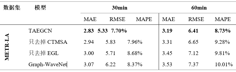 为了验证关键部件的有效性,对METR-LA数据集的预测在30分钟和60分钟时间长度上进行了消融研究。实验结果如表2所示。