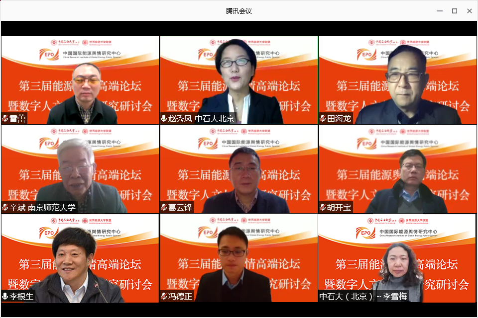 为深入贯彻“新文科”建设精神,推动结合校本特色的跨学科融合,12月17日至18日,中石大外国语学院和世界能源大学联盟秘书处联合主办了第三届能源舆情高端论坛暨数字人文与话语研究研讨会。本次会议由中国国际能源舆情研究中心承办,中国英汉语比较研究会话语研究专业委员会和专门用途英语专业委员会能源英语分会提供学术支持。来自国内外多所高校及机构的500余位专家学者和青年学子在线参与了本次论坛,近1500名观众收看了本次论坛现场的视频直播。
