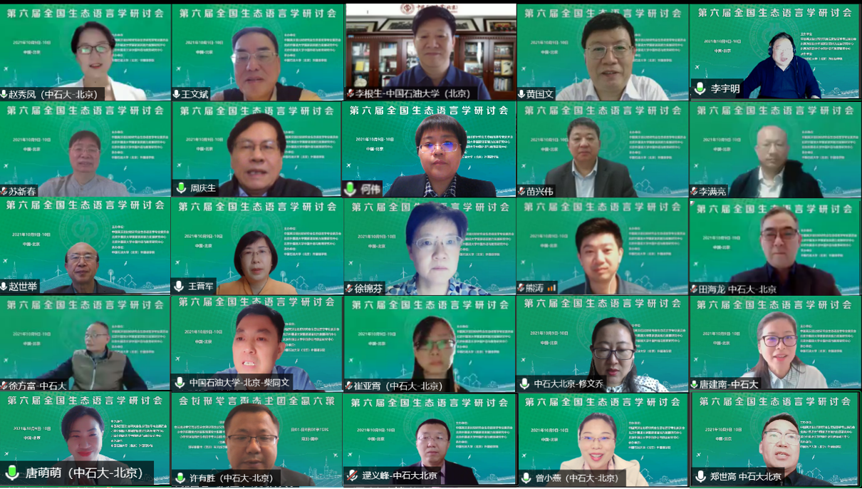 2021年10月9日-10日,“第六届生态语言学研讨会”在中国石油大学(北京)成功召开。本次会议由中国英汉语比较研究会生态语言学专业委员会、北京外国语大学国家语言能力发展研究中心、中国外语与教育研究中心主办,中国石油大学(北京)外国语学院承办, Journal of World Languages (De Gruyter)、《中国外语》等期刊编辑部协办。来自国内外160余所高等院校和科研机构的367位专家学者、硕博研究生参加了此次会议,在线直播点击量超过2万人次,具有良好的影响力和传播力。