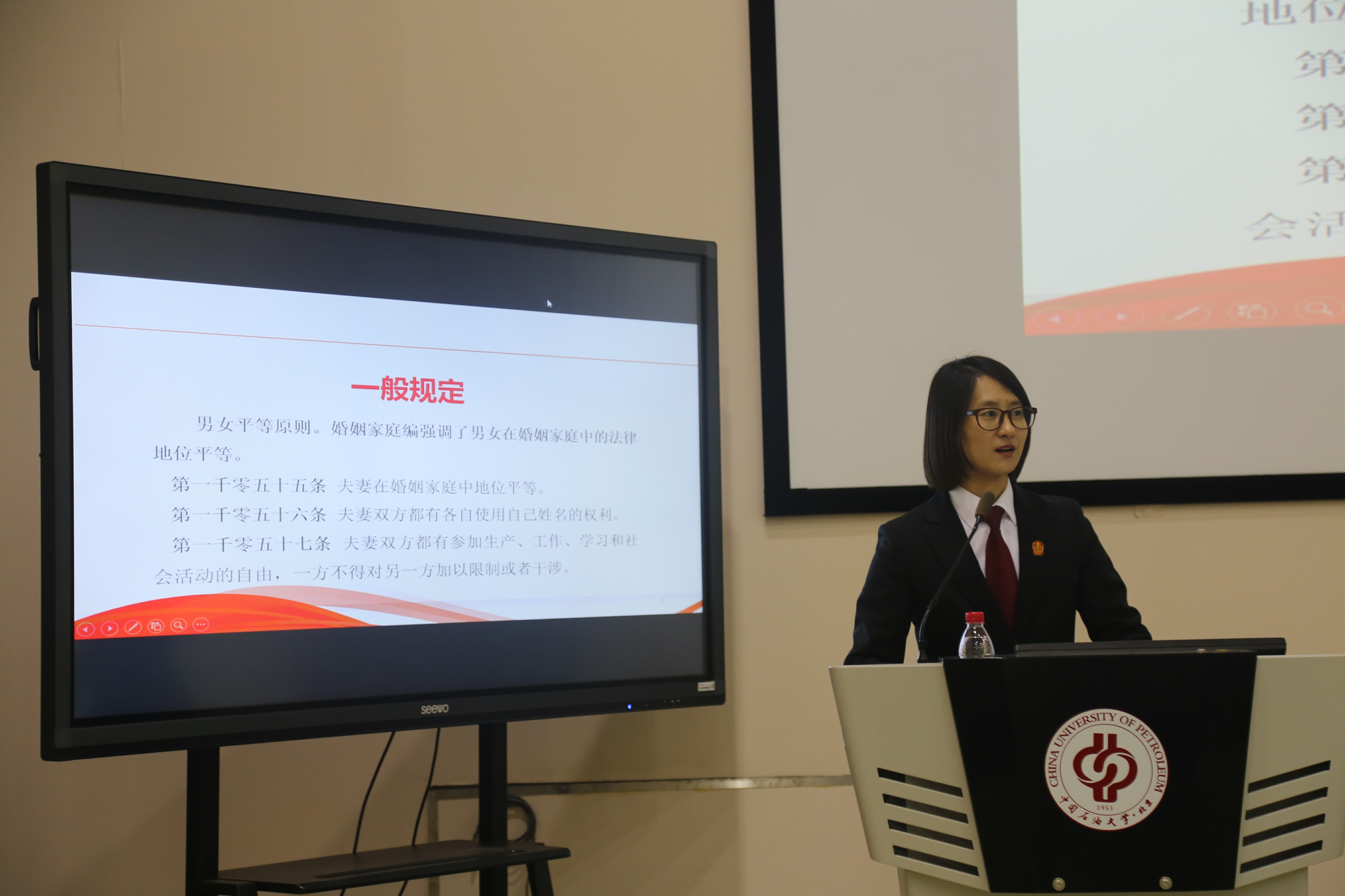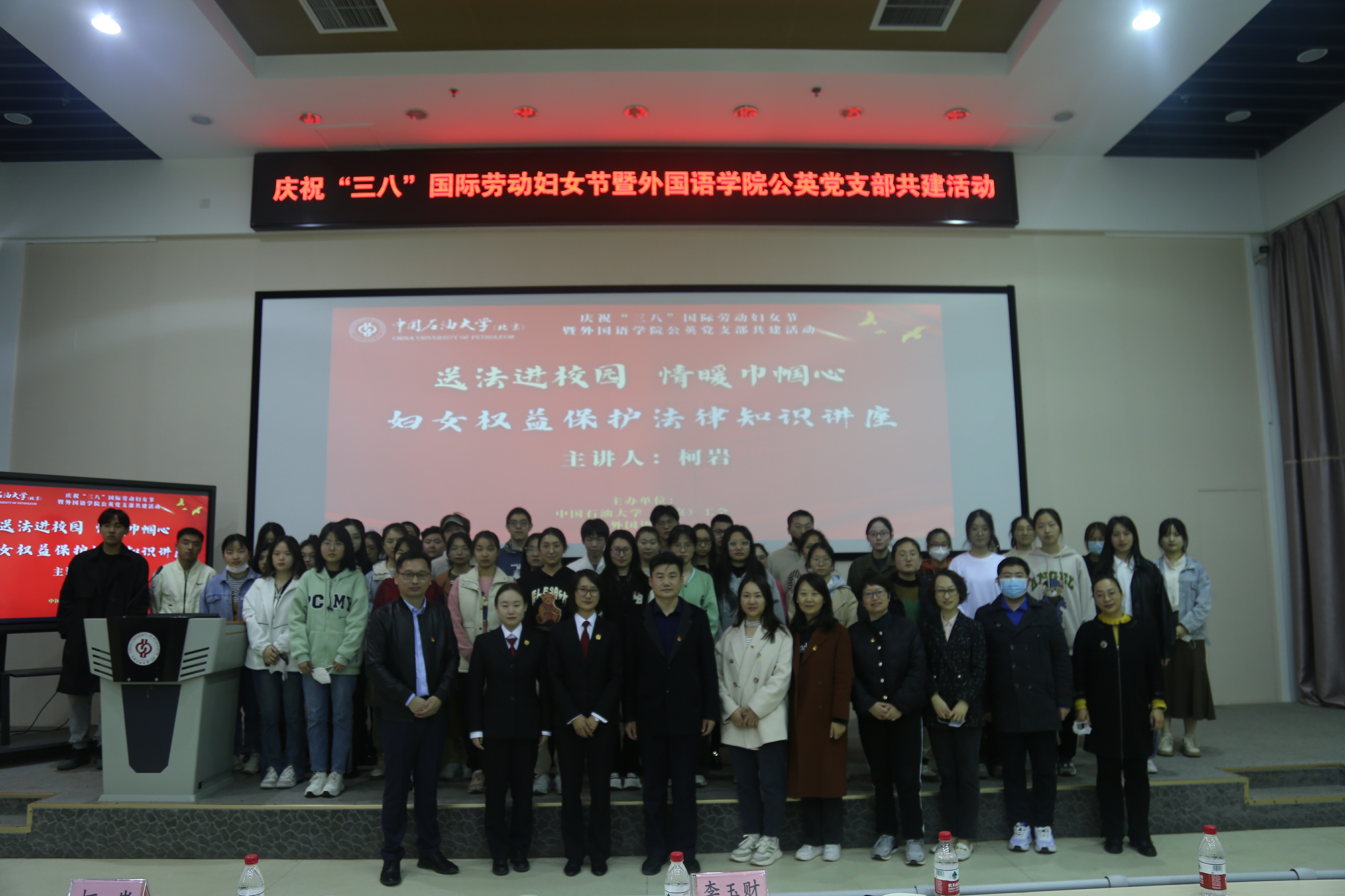 第113个“三八”国际劳动妇女节到来之际,为进一步提高女性教职工和学生法律意识和依法维权能力,形成尊重和保护妇女权益的良好氛围,外国语学院公英党支部联合中国石油大学(北京)工会共同举办“送法进校园,情暖巾帼心”普法讲座。3月9日下午,北京市朝阳区人民法院民事审判二庭柯岩法官应邀在第四教学楼401教室作了“妇女权益保护”法律知识讲座,外国语学院党委书记李玉财、学院师生代表参会,讲座由中国石油大学(北京)工会常务副主席肖中琼主持。