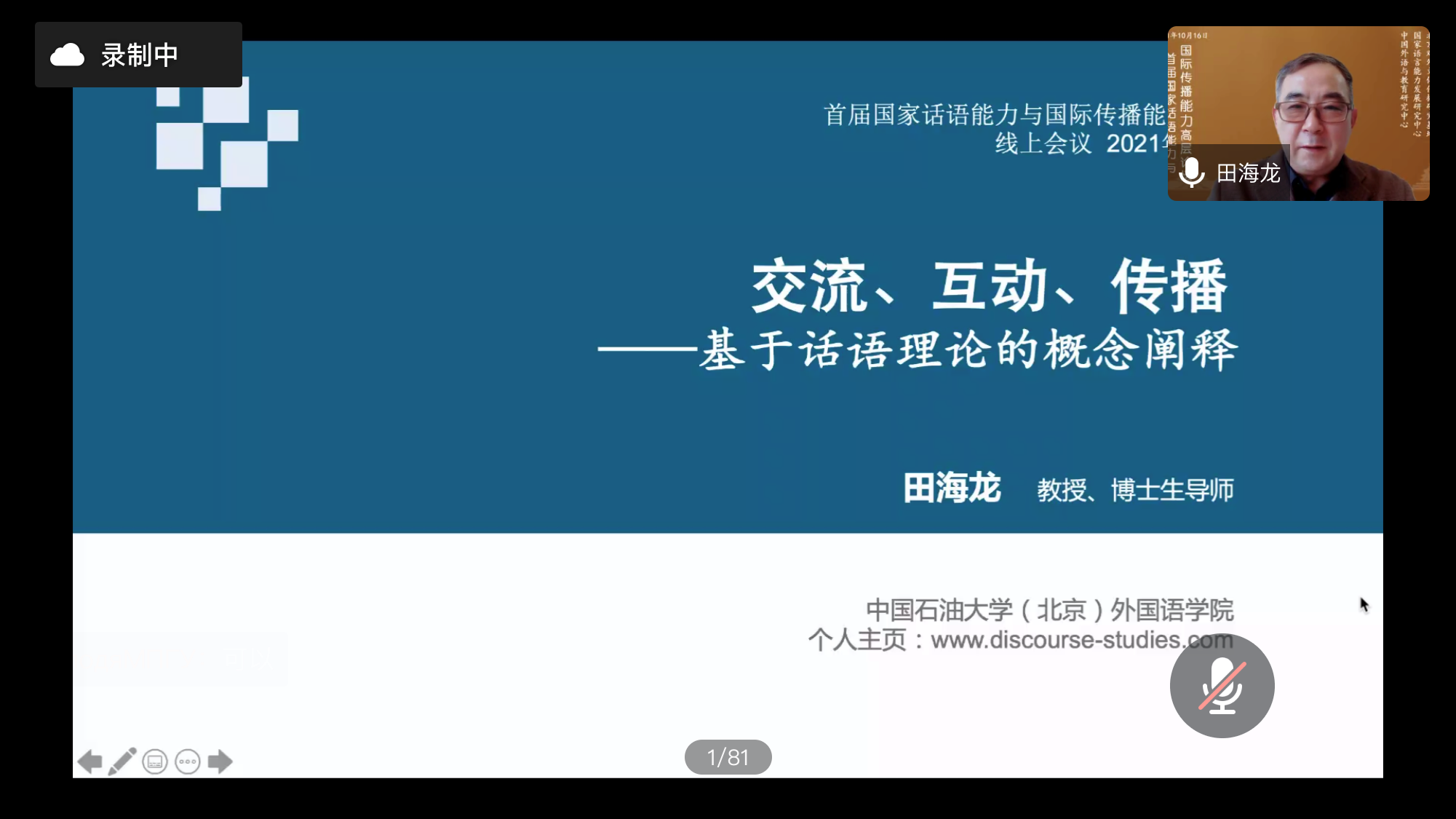 2021年10月16日,中国石油大学(北京)外国语学院特聘教授田海龙线上参加了首届国家话语能力与国际传播能力高层论坛。