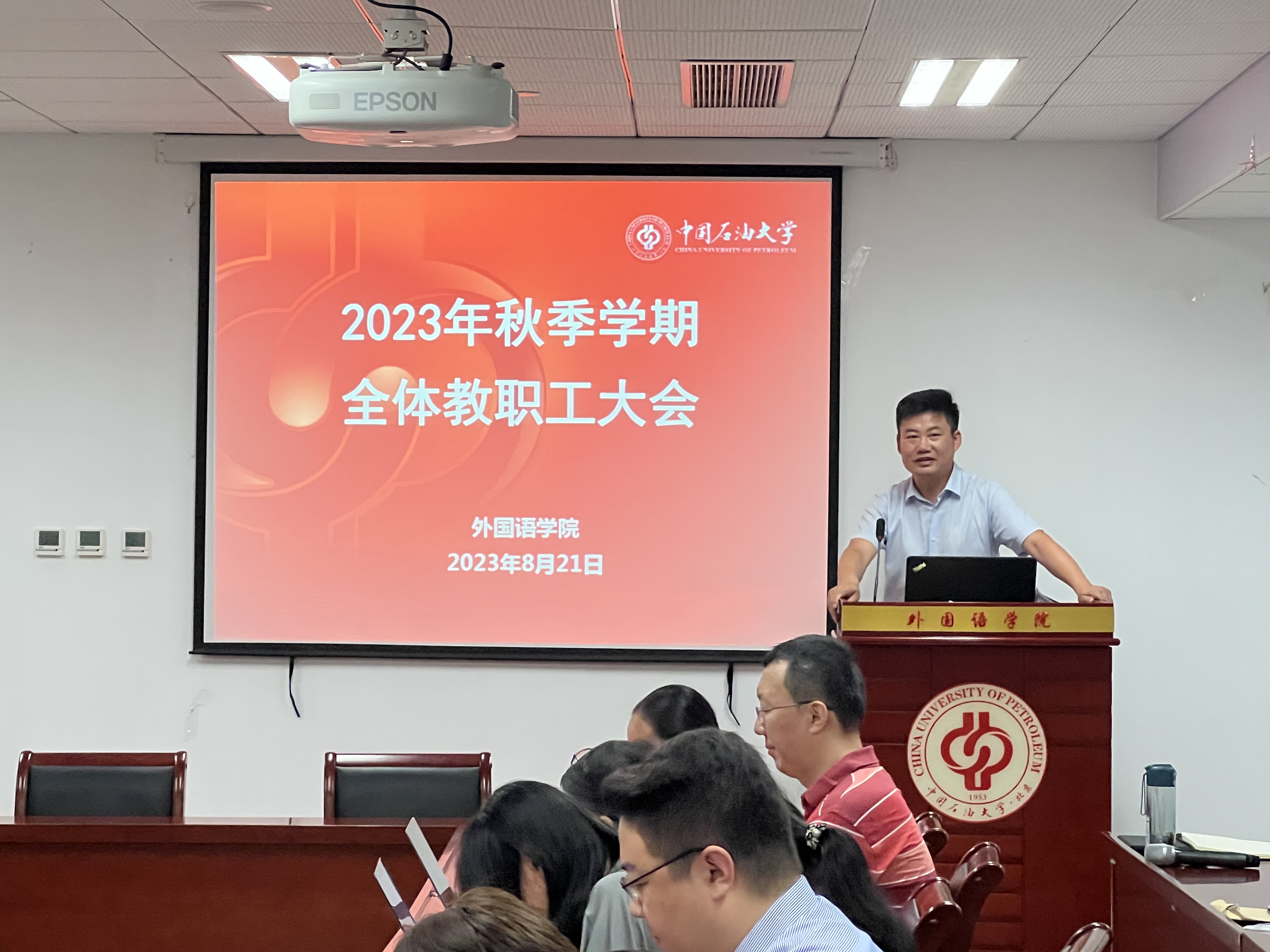 8月21日上午,外国语学院2023年秋季学期开学初全体教职工大会暨本科教育教学审核评估工作动员部署会于主楼A822召开,学院领导班子成员及全体教职工参加会议,会议由学院党委书记李玉财主持。