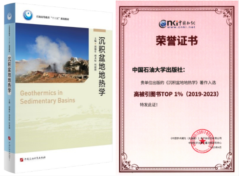 本次所发布榜单以2019—2023年我国出版图书为评价对象,从约5.9万种学术著作及1.1万种译著入选待评书目中,以中国知网收录的期刊论文、会议论文和博硕士学位论文为引证统计源,以被引频次为统计指标,经定量遴选和两轮同行评议,评选出17个学科领域共637种高频被引图书书目,形成“高被引图书Top 1%(2019-2023)”榜单。《沉积盆地地热学》的入选,反映了我院地热资源领域教学、科研在国内的重要影响力。