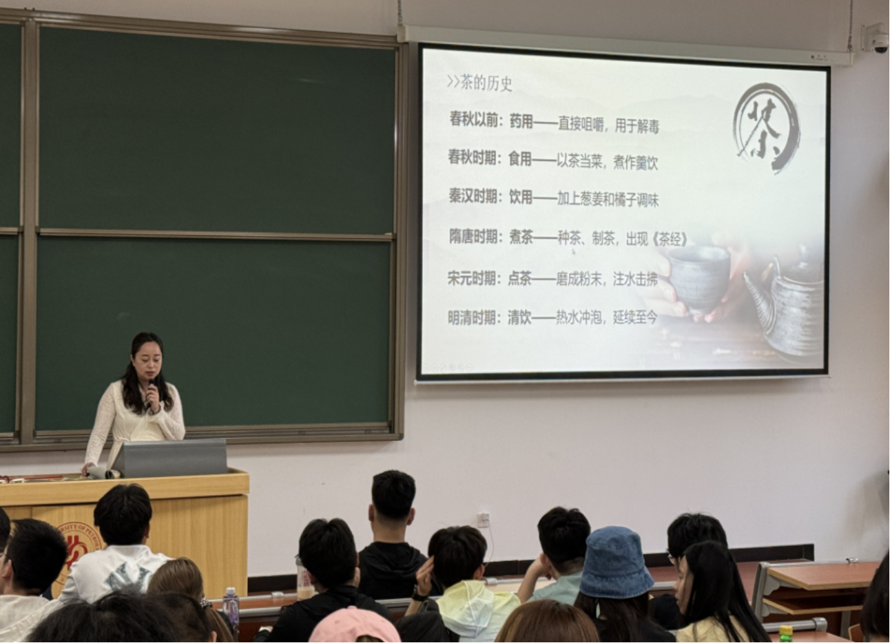 刘蓓蕾老师深入阐释了文化自信的重要性,介绍了中国传统文化的三个层面,即得天独厚的地理环境、海纳百川的精神内核和丰富多彩的表现形式,使同学们更深刻地理解了十九大报告中提出的推动中国传统文化的传播与发展,要通过创造性转化和创新性发展的意指。同时通过生动的讲解和丰富的图片向大家展示了中华民族优秀传统文化的重要组成部分——茶文化,让同学们体会了中国历史的深厚底蕴和中国文化的独特价值。