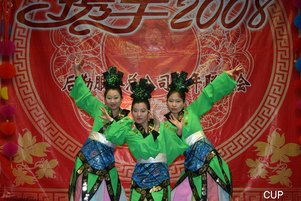 来自各部门的近600位新老职工同欢乐,共祝愿,辞旧迎新。舞台的天幕上高挂着大红的中国结,预示着来年后勤服务总公司的各项工作也将硕果累累,并衬托起联欢会的主题:携手2008。