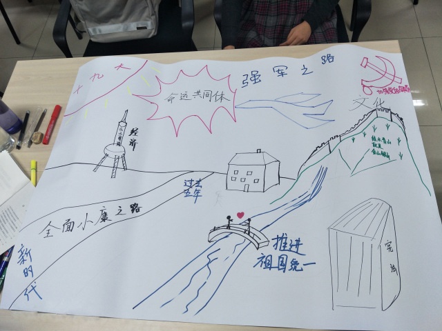 另一组将党的十九大新征程用绘画的形式表示了出来,生动形象体现出新时代的青年人沐浴在十九大的光辉之下。“我们要建设人类命运共同体。这更要求我们青年学子一张蓝图绘到底,撸起袖子加油干!不忘初心,方得始终。”
