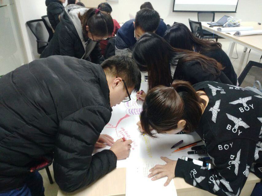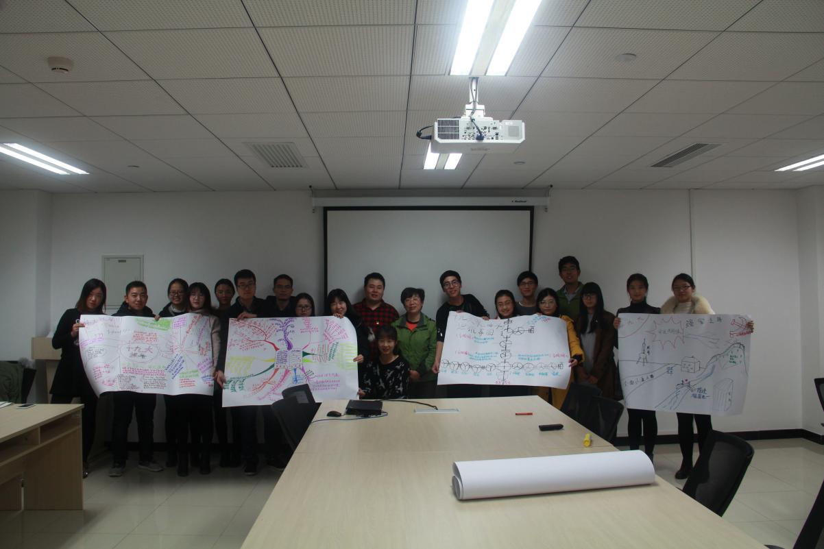 活动中期,大家学习了思维导图以及思维导图在学生干部培养中的应用,将两个支部的党员分成了四个小组,师生联手绘制“党的十九大报告”思维导图,场面活跃。