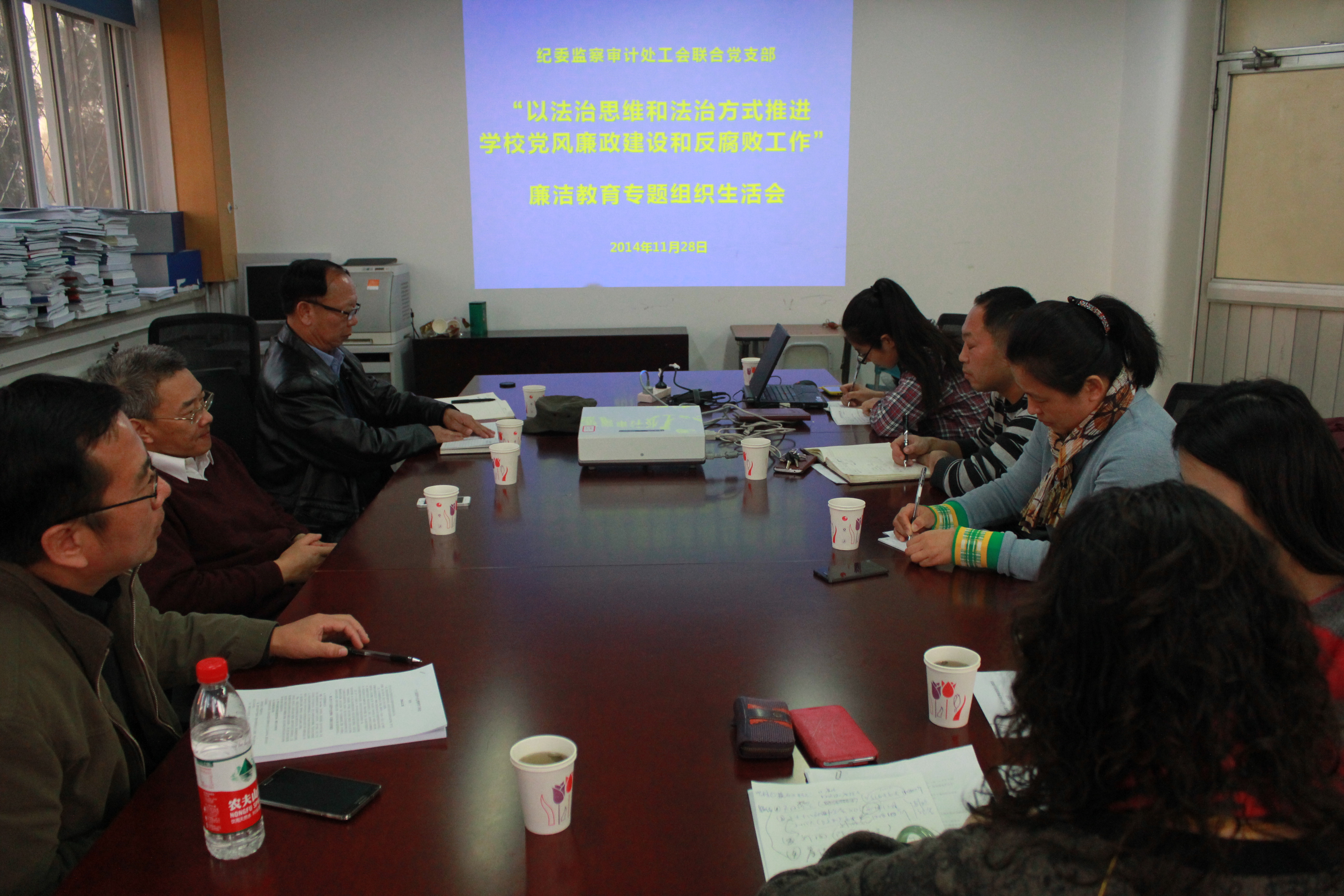 11月28日,纪委监察审计处、工会党支部在办公楼B座102会议室开展了“以法治思维和法治方式推进学校党风廉政建设和反腐败工作”为主题的党支部廉洁教育专题组织生活会。支部全体成员参加了会议,会议由支部书记孔繁青支持。