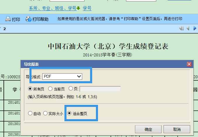 一、在弹出的导出报表对话框中,选择适合整页选项,点击确定