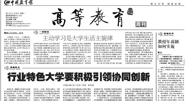 11月28日出版的《中国教育报》第5版高等教育周刊刊发了中国石油大学校长张来斌的署名文章《行业特色大学要积极引领协同创新》。