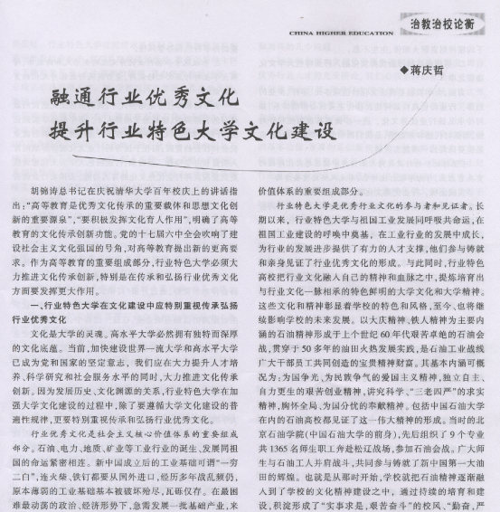 全国中文核心期刊《中国高等教育》杂志2012年第2期“治教治校论衡”栏目刊登中国石油大学党委书记蒋庆哲撰写的理论文章:《融通行业优秀文化 提升行业特色大学文化建设》。