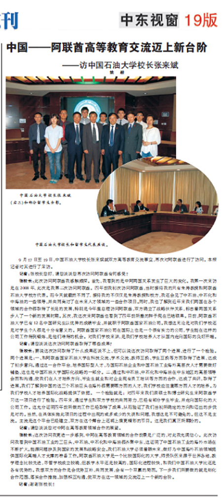 在10月9日出版的《人民日报》海外版中东刊中东视窗板块刊登了就高等教育事宜访问阿联酋的中国石油大学校长张来斌接受《人民日报》记者访问的报道。
