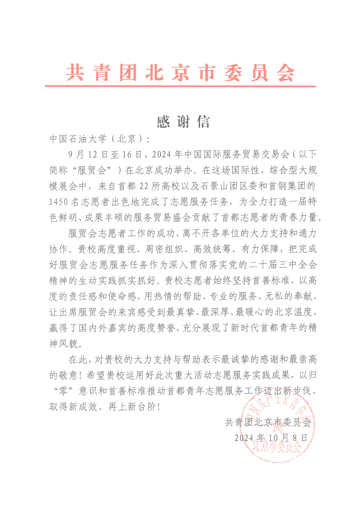 10月8日,共青团北京市委员会向中国石油大学(北京)发来感谢信,对学校在2024年中国国际服务贸易交易会志愿服务保障工作的大力支持表示感谢。