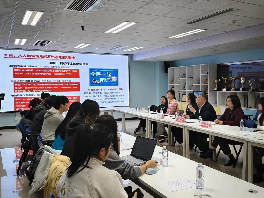 黄磊作题为“心怀‘国之大者’,树牢总体国家安全观”的辅导报告,带领全体同学从意识形态、热点问题、反诈工作、消防安全等方面开展安全教育学习,帮助学生坚定理想信念,铸牢安全意识。