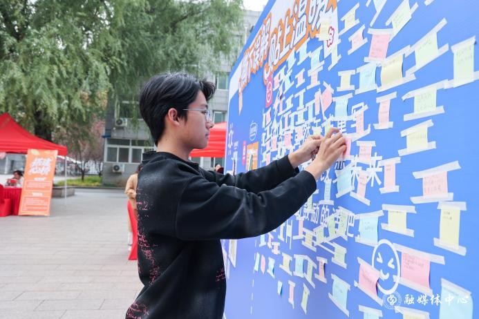 “自我探索区”内,“知心竞答”环节以趣味答题的方式向同学们普及心理学知识;“撕下标签”活动引导同学们撕掉“焦虑即软弱”等负面刻板印象,传递积极寄语;“幸福长河”画布前,同学们用画笔勾勒生活点滴,从“食堂的一碗热粥”到“图书馆的窗外落日”,共绘幸福画卷。