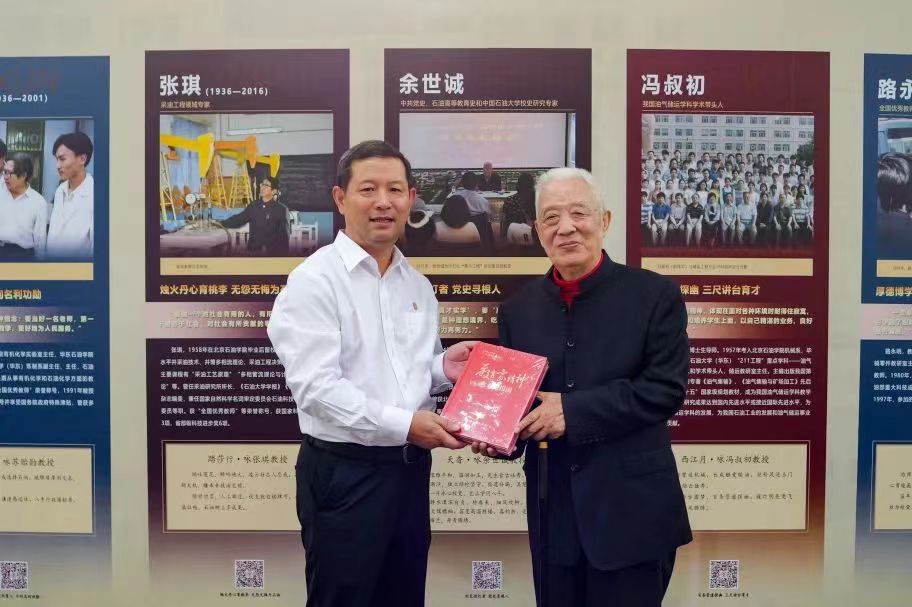 王同奇向余世诚赠送《教育家精神与石油报国》丛书。