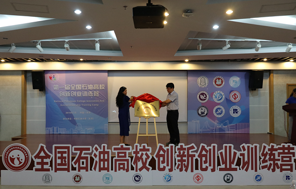 韩尚峰和张静为全国石油高校创新创业训练营揭牌。