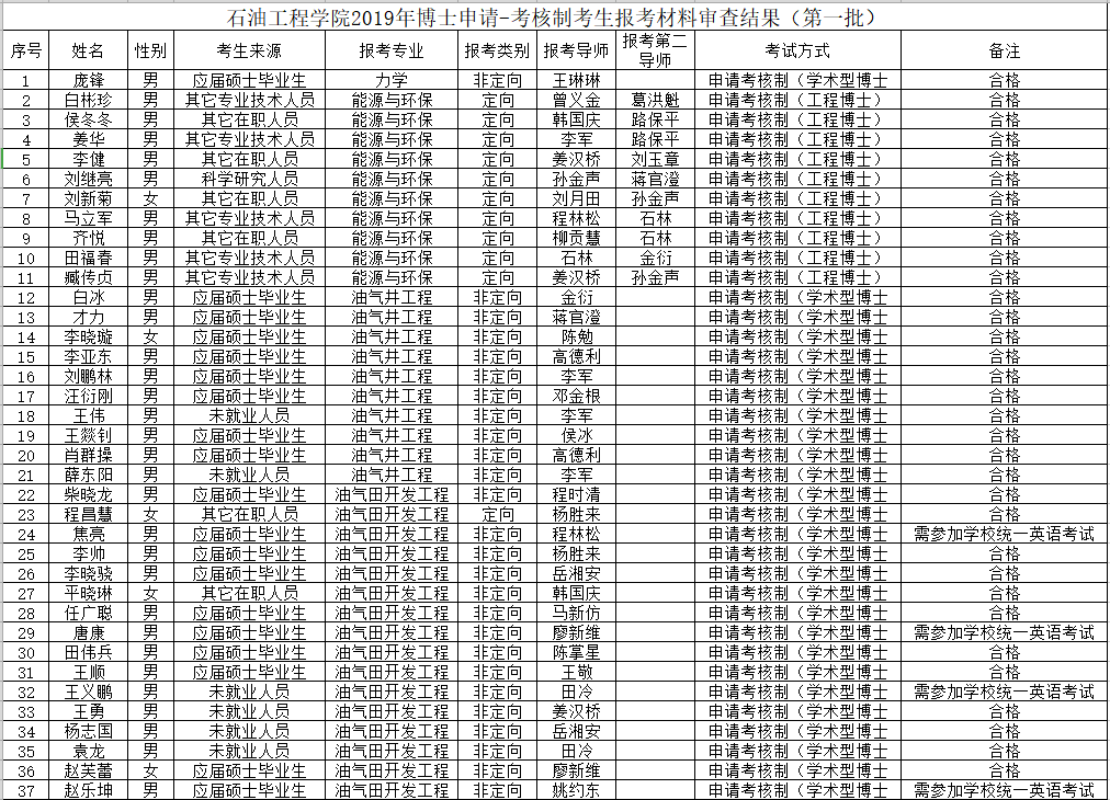 石油工程学院2019年博士申请-考核制考生报考材料审查结果(第一批)