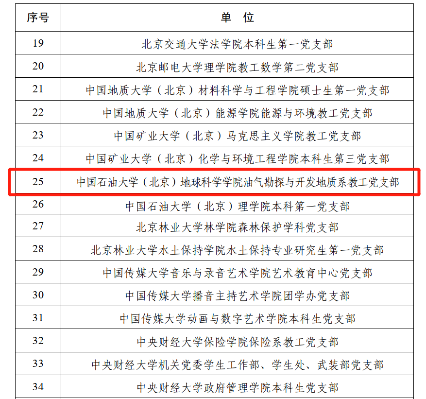 近日,教育部办公厅印发《关于公布第三批全国党建工作示范高校、标杆院系、样板支部培育创建单位名单的通知》(教思政厅函〔2022〕4号),中国石油大学(北京)地球科学学院油气勘探与开发地质系教工党支部入选第三批“全国党建工作样板支部”培育创建单位名单,建设周期为2022年3月至2024年3月。