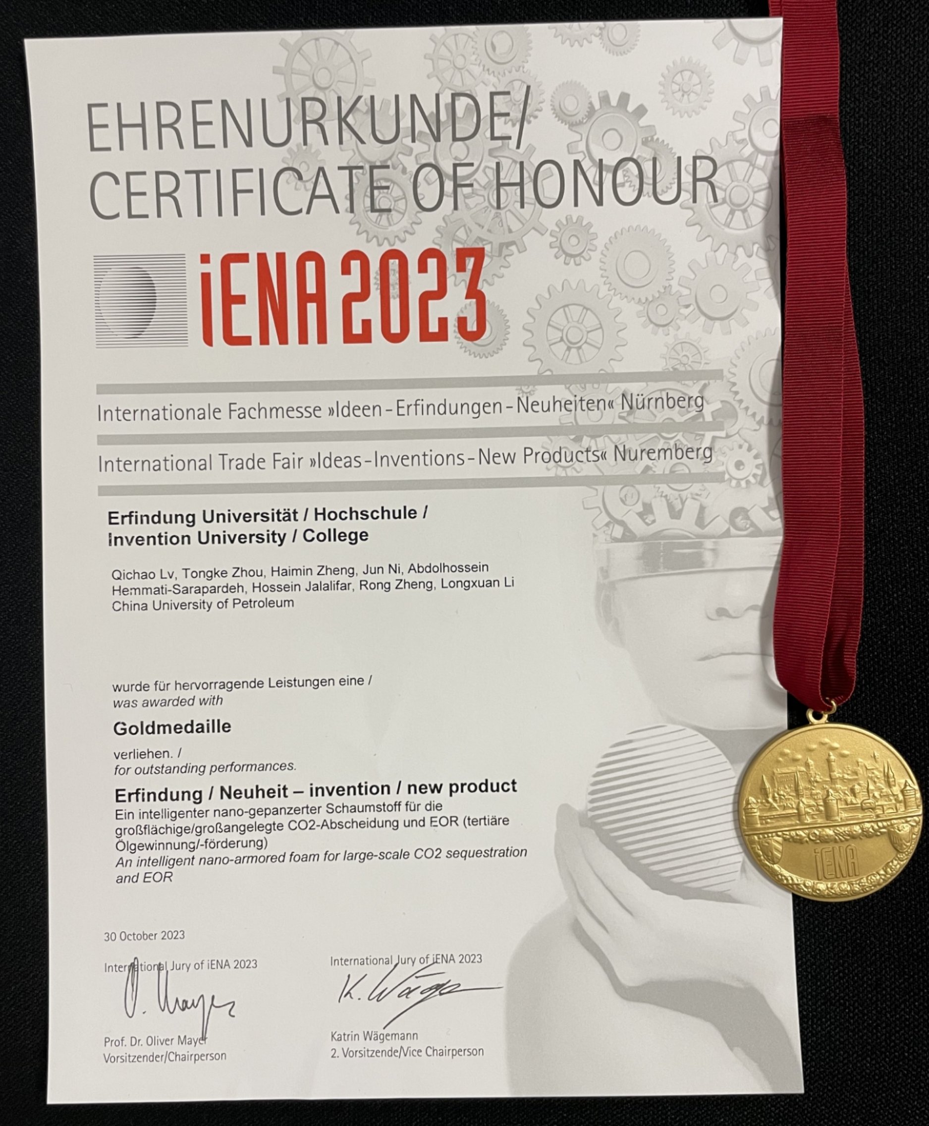 10月28日至30日,第75届德国纽伦堡国际发明展举办,来自全球30个国家和地区的500多项发明项目参展。实验室吕其超团队牵头,联合英国曼彻斯特大学、延长油田等单位科研人员共同完成的“智能纳米铠甲泡沫规模化封碳驱油技术”项目荣获德国纽伦堡国际发明展金奖。为表彰该成果在应对全球气候变化方面作出的创新贡献,国际发明者协会联合会(IFIA)授予该项成果最佳发明奖(本届仅2项)。