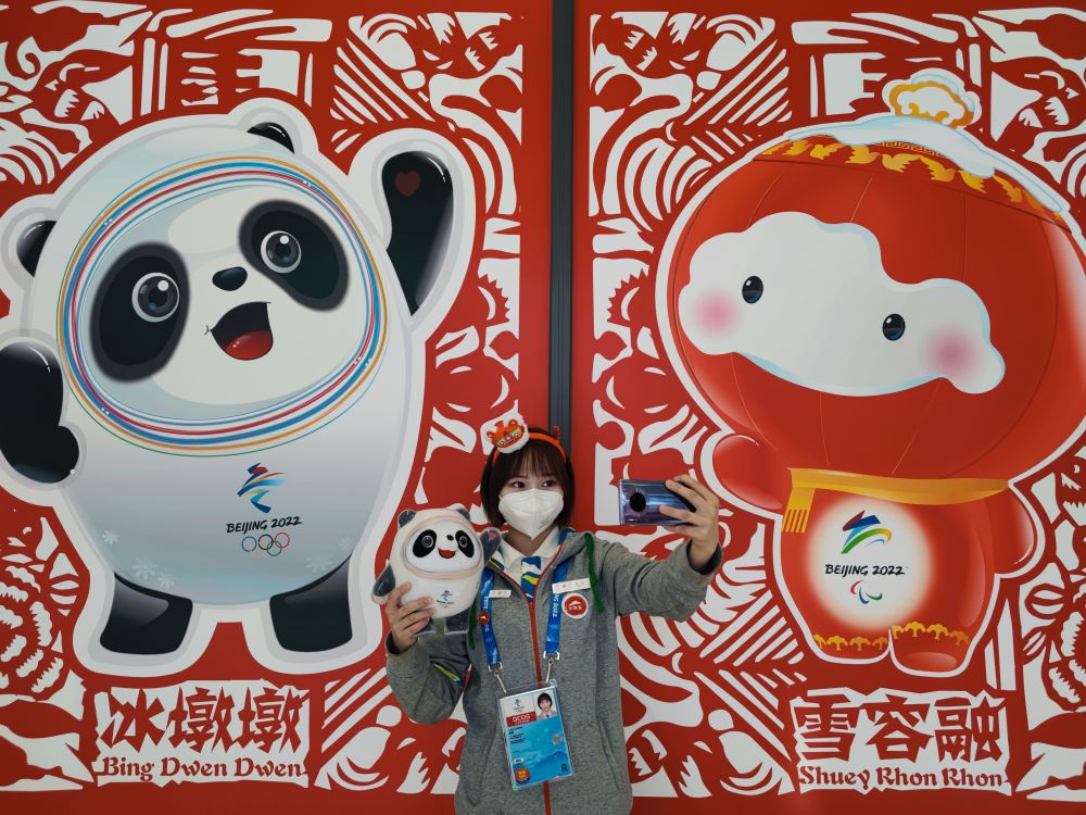 一名志愿者在延庆冬奥村自拍留念(1月31日摄)。新华社发(安曜扬摄)