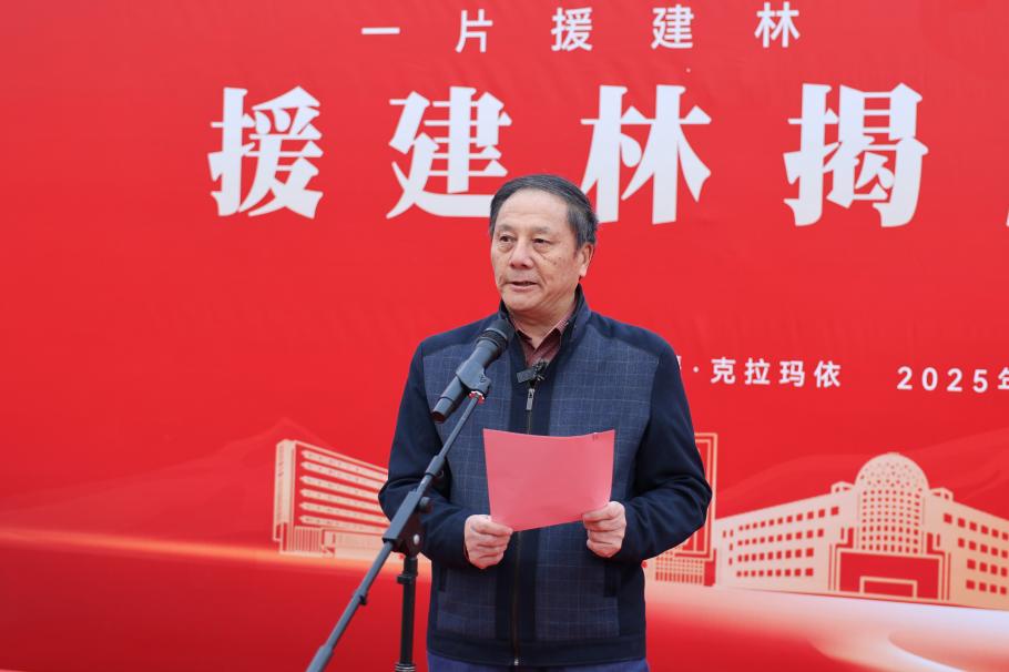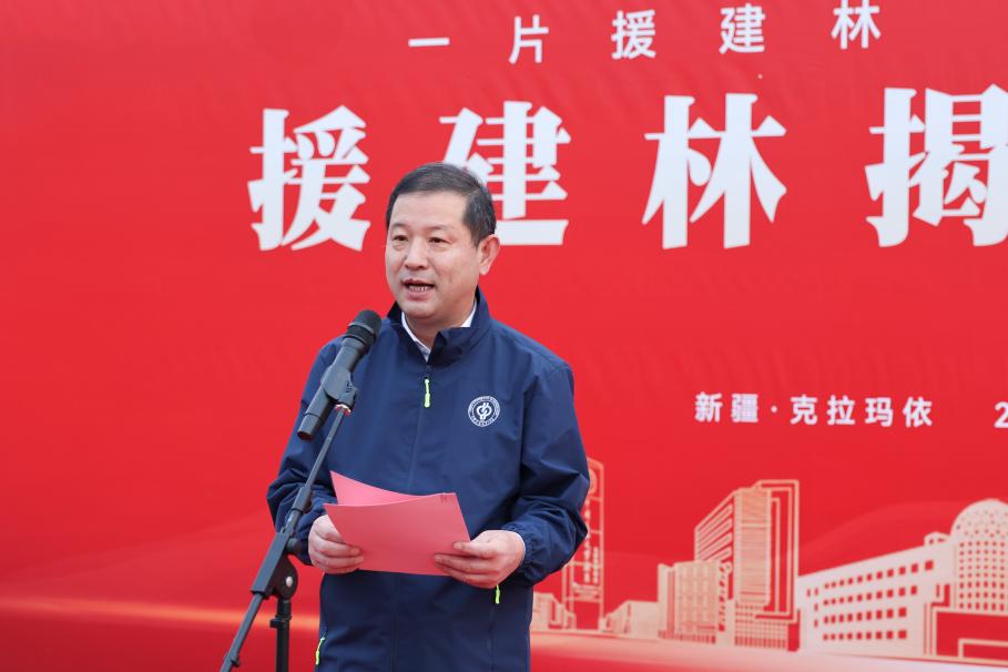 王同奇在主持中表示,这片由援建教师亲手种植的胡杨林,象征着教育援疆事业在这片热土上“落地生根、枝繁叶茂”,更承载着教育援疆的深情厚谊,凝聚着多方共建、校地协同的丰硕成果。援建林揭牌仪式,不仅是一段情谊的“里程碑”,更是一段新征程的“起跑线”。这片援建林,将与所有扎根新疆的教育者一起成长,与服务教育援疆的克拉玛依校区共同奋进,见证西部高等教育振兴之路越走越宽。