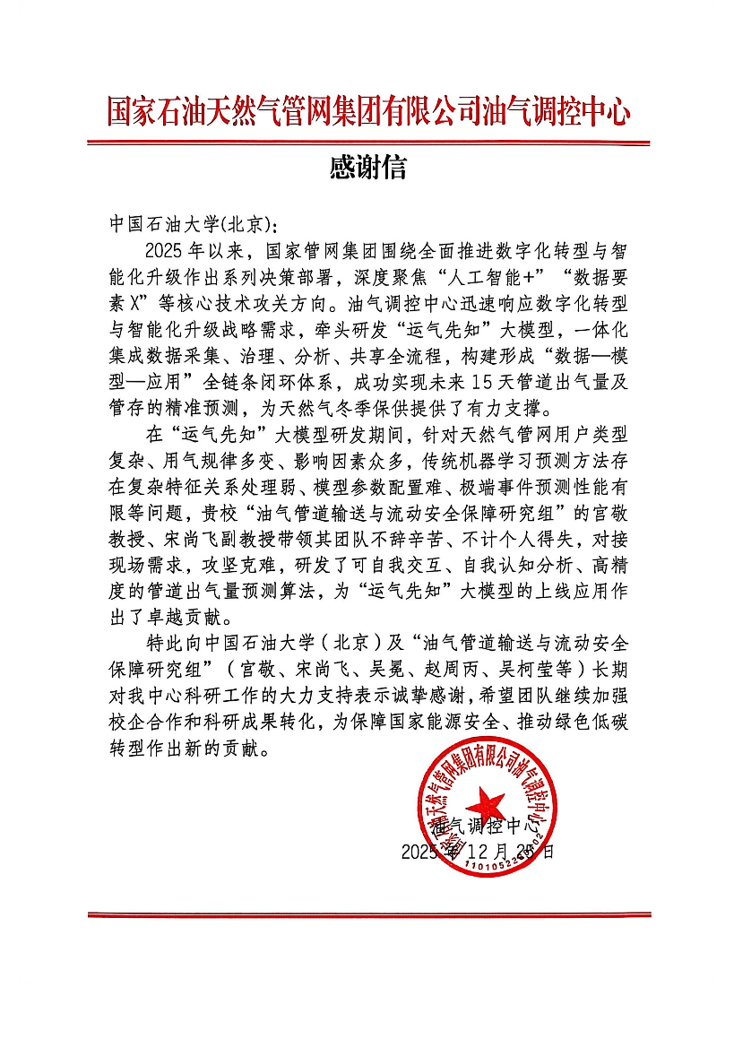 近日,国家石油天然气管网集团有限公司油气调控中心向中国石油大学(北京)发来感谢信,对学校在“运气先知”大模型研发中的突出贡献表示感谢。