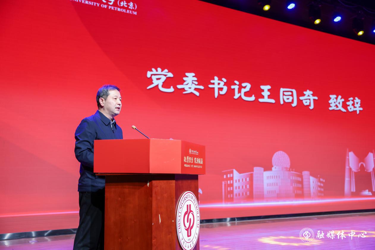 王同奇在致辞中向受到表彰的同学们表示祝贺,向长期以来支持关心学校建设发展、关心学子成长的设奖企业与个人表示感谢,向学校全身心投身育人工作的教职员工表示问候。他指出,过去一年,党的二十届四中全会统筹教育强国、科技强国、人才强国建设,一体推进教育科技人才发展,学校坚持以高质量党建引领事业高质量发展,深入实施新时代立德树人工程,在党建思政、学科建设、人才培养、科技创新等方面取得丰硕成果,以优异成绩交出了“教育强国建设,中石大有为”的奋进答卷。他表示,学校已连续20年举办颁奖典礼,这次聚焦“挺膺担当 能源报国”主题作出升级调整,重新建构学生荣誉体系,首次评选中石大学生最高荣誉奖,全面选树展示各类优秀学生个人和先进集体典型,着力打造新时代立德树人工程重要载体,以身边榜样激发奋进力量,让遇见光、追逐光、成为光、辐射光在校园充盈彰显。他勉励广大学子坚定报国初心,把准青春航向,深入学习贯彻习近平总书记重要回信精神,把个人理想融入党和国家事业之中,在能源报国时代赛道上找准定位、奋勇争先;加强示范带动,永葆感恩之心,以实际行动回馈社会、回报行业、传递爱心;要锤炼过硬本领,勇担时代使命,深耕专业知识,投身生产实践,提升创新创业能力,在能源强国建设新征程中勇挑重担、建功立业。