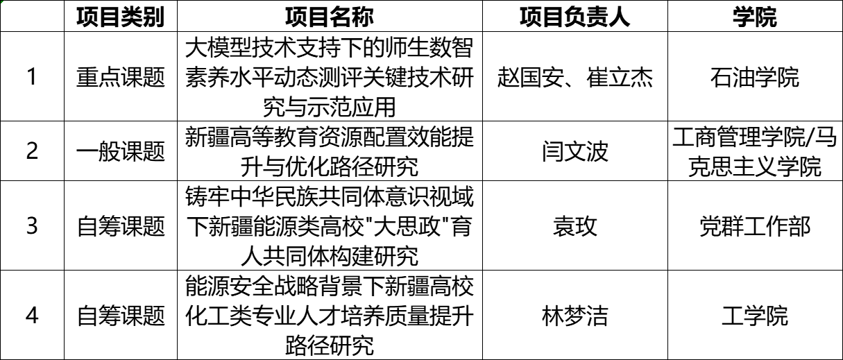 近日,新疆维吾尔自治区教育科学研究院发布《关于2025年度自治区教育科学规划课题立项名单的公示》,中石大克拉玛依校区4个项目获批立项。