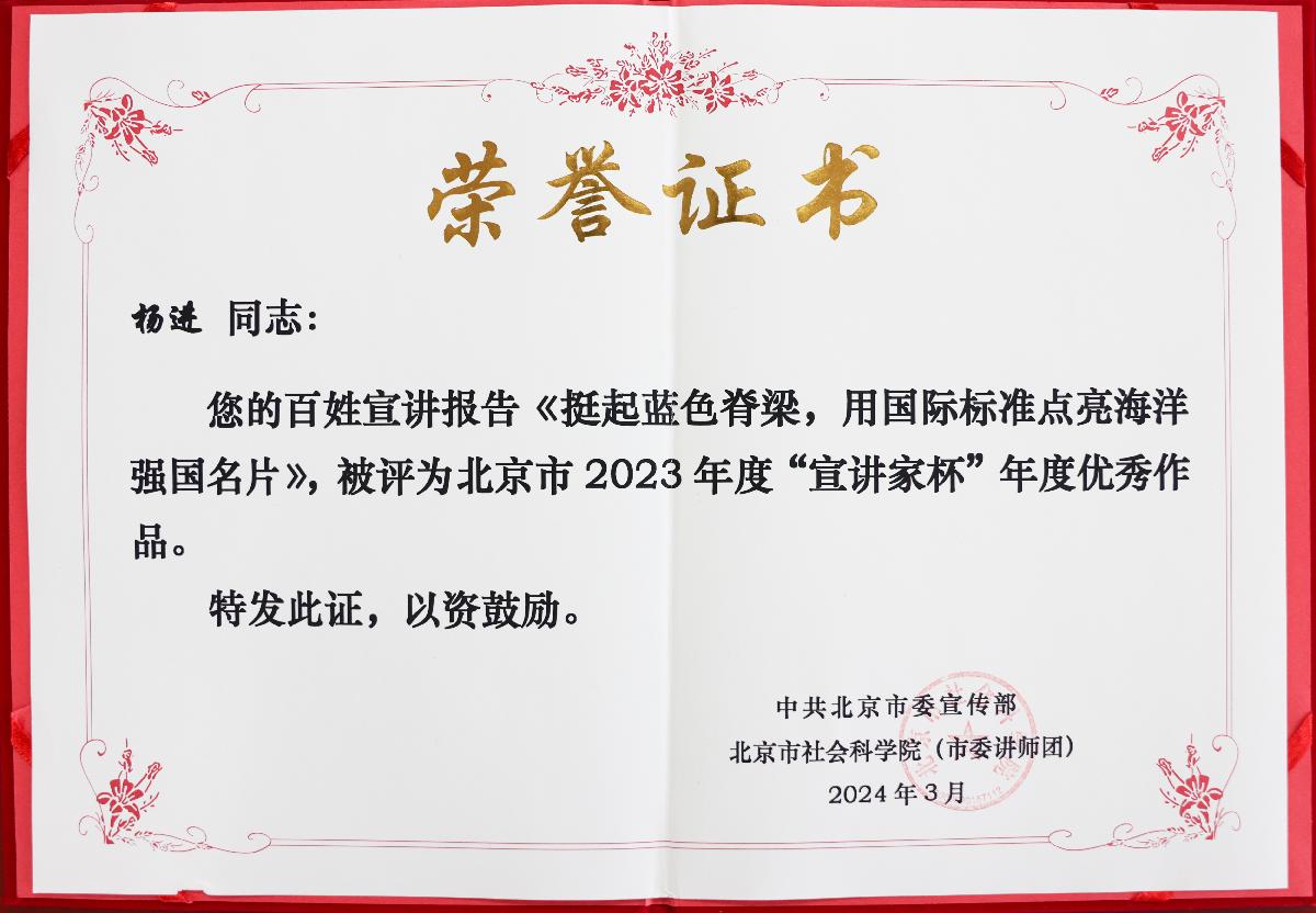 近日,北京市委宣传部、北京市社会科学院(市委讲师团)公布了2023年度“宣讲家杯”优秀报告(党课)评选结果。安全与海洋工程学院院长、深海工程团队党支部书记杨进的作品《挺起蓝色脊梁,用国际标准点亮海洋强国名片》获评2023年度“宣讲家杯”优秀百姓宣讲作品,为北京高校获得的4部优秀百姓宣讲作品之一。