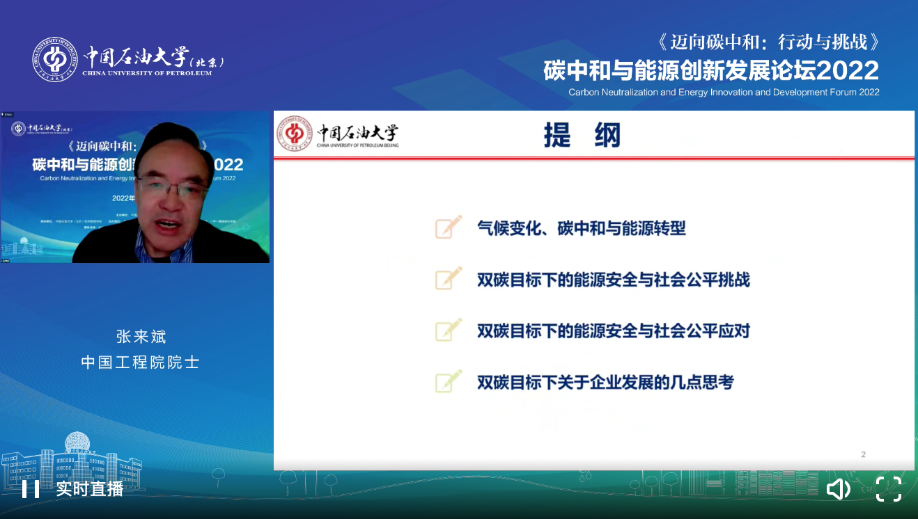中国工程院院士、中国工程院原副院长、中国工程物理研究院高级科学顾问、应用物理、强激光技术和能源战略专家杜祥琬,中国工程院院士、石油地质学与勘探著名专家、教授级高级工程师、中国工程院能源与矿业工程学部副主任赵文智,中国工程院院士、中国石油大学(北京)教授、应急管理部油气生产安全与应急技术重点实验室主任、国务院第八届安全科学与工程学科评议组召集人、全国政协常委张来斌,中国社会科学院学部委员、中国社科院大学教授、中国城市经济学会会长、中国生态文明研究与促进会副会长、国家气候变化专家委员会委员潘家华,中国海油集团能源经济研究院党委书记、院长、教育部哲学社会科学研究重大课题攻关项目首席专家王震,北京航空航天大学经济管理学院院长、国家基金创新研究群体学术带头人、国家杰出青年科学基金资助获得者、教育部长江学者特聘教授范英,中国社会科学院工业经济研究所所长、二级研究员、《中国工业经济》和《经济管理》主编、中国工业经济学会理事长、中国区域经济学会会长史丹,中国石油大学(北京)经济管理学院名誉院长、中国科学院数学与系统科学研究院研究员、中国系统工程学会理事长、《系统工程理论与实践》和《系统科学与数学》主编杨晓光,中国石油大学(北京)校长吴小林出席论坛。来自多所高校和研究机构的专家学者、企业界人士、社会公众等参加线上论坛。