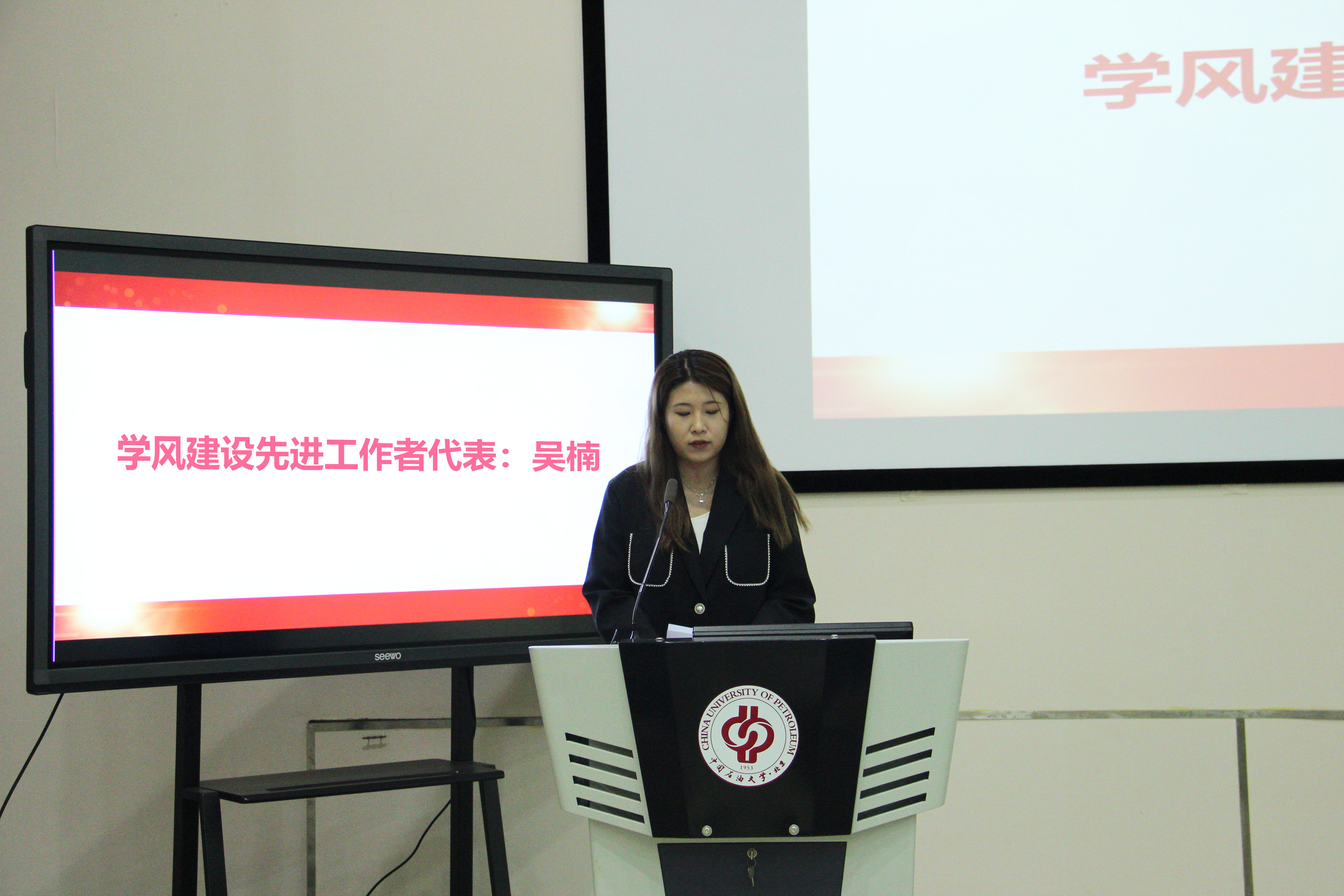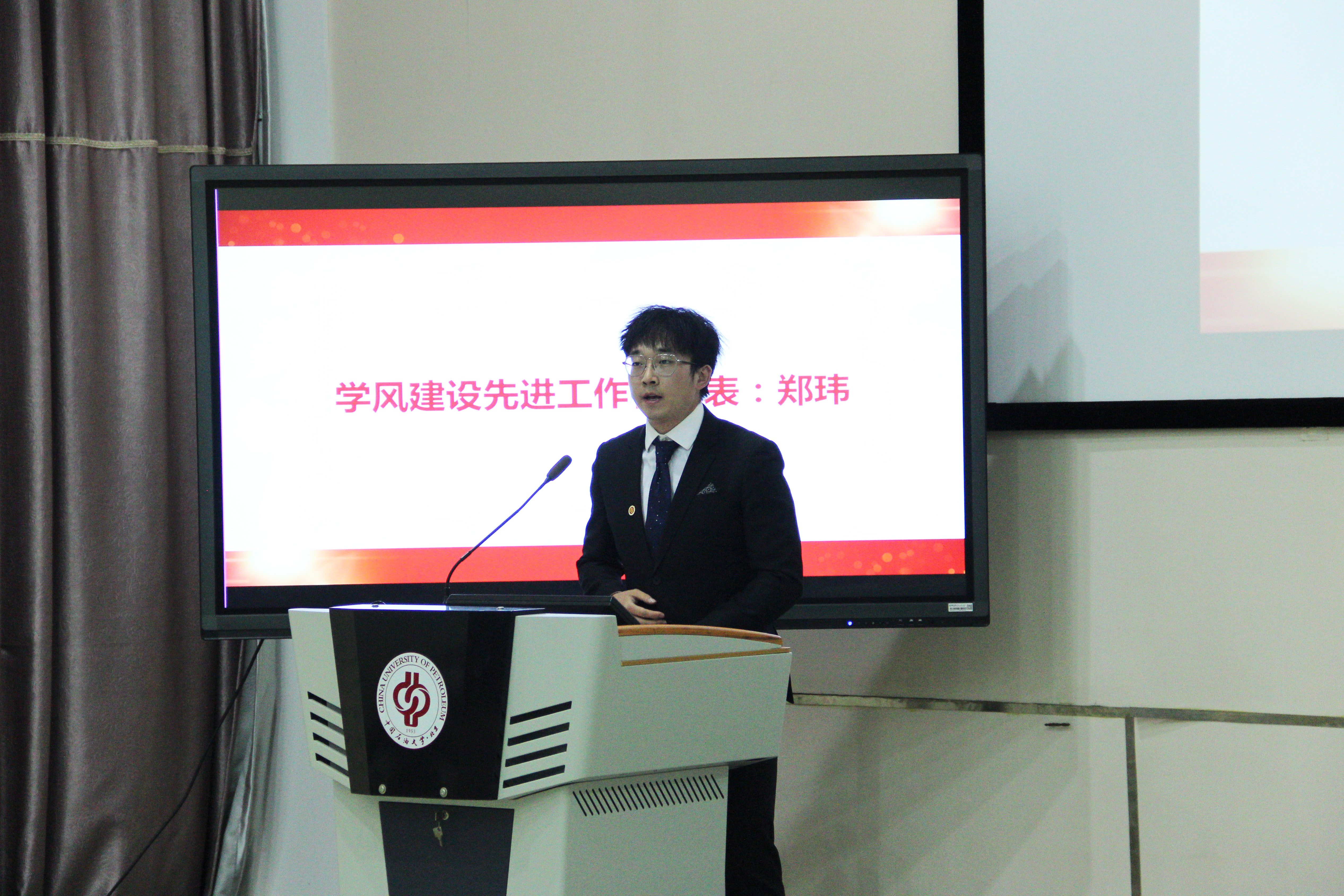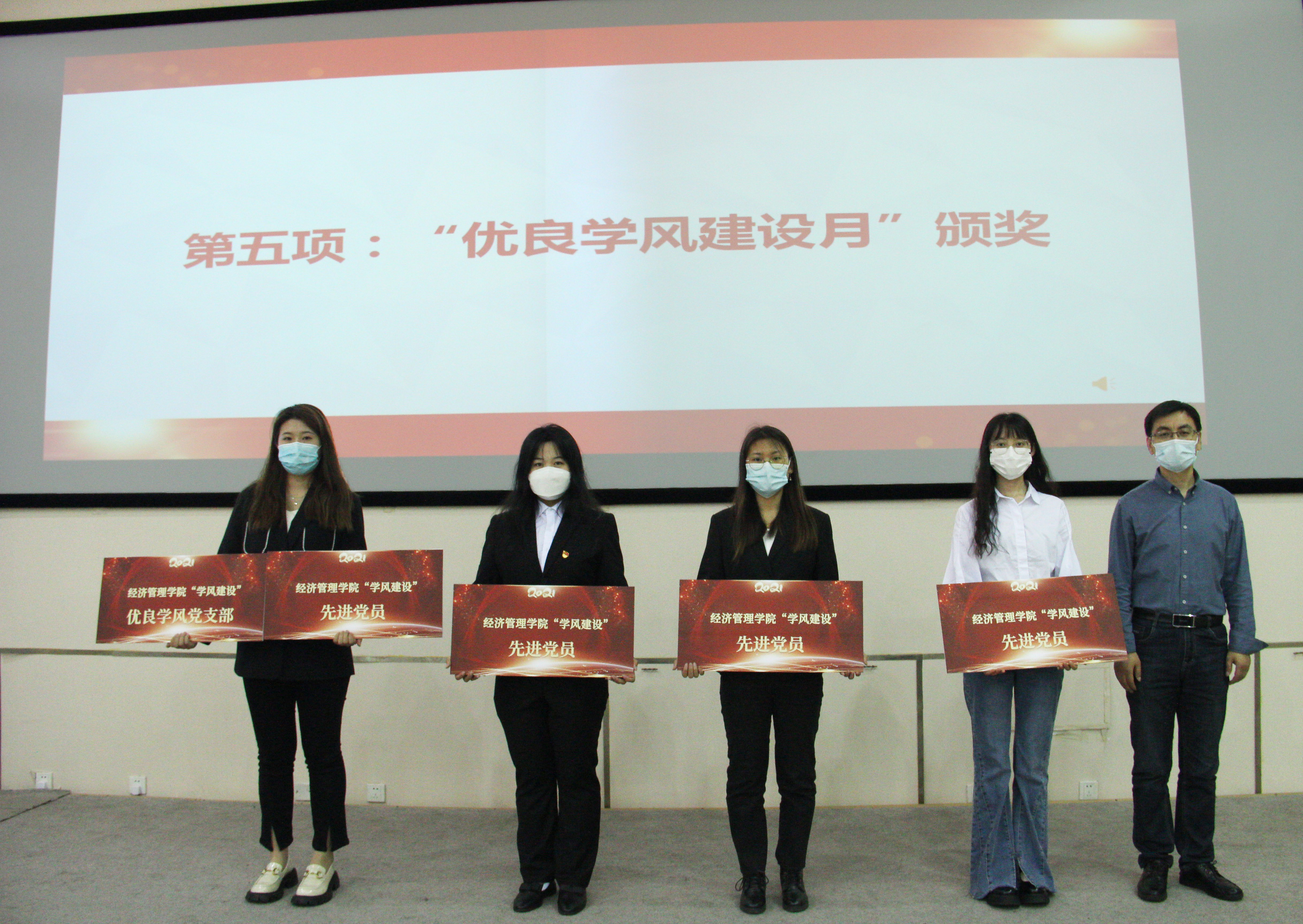 赵晓丽宣读了《关于表彰经济管理学院2021年度优良学风党支部、班级、宿舍和个人的决定》,并宣布了表彰名单,表扬了受表彰的集体和个人。
